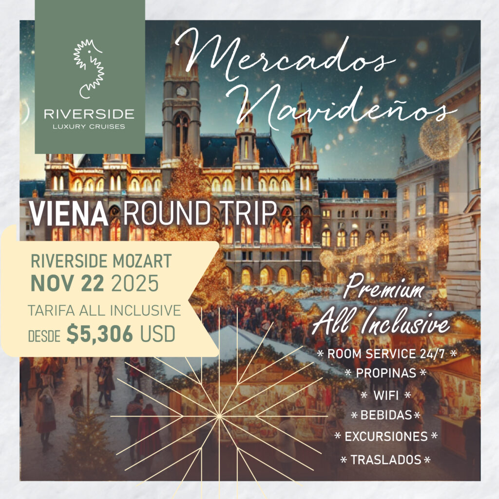 Ofrece experiencias inigualables en los Mercados Navideños del centro de Europa, Colonia y Frankfurt por el río Rin. a bordo del Riverside Mozart. O bien Viena y el valle Wachau por el río Danubio a bordo del Riverside Debussy